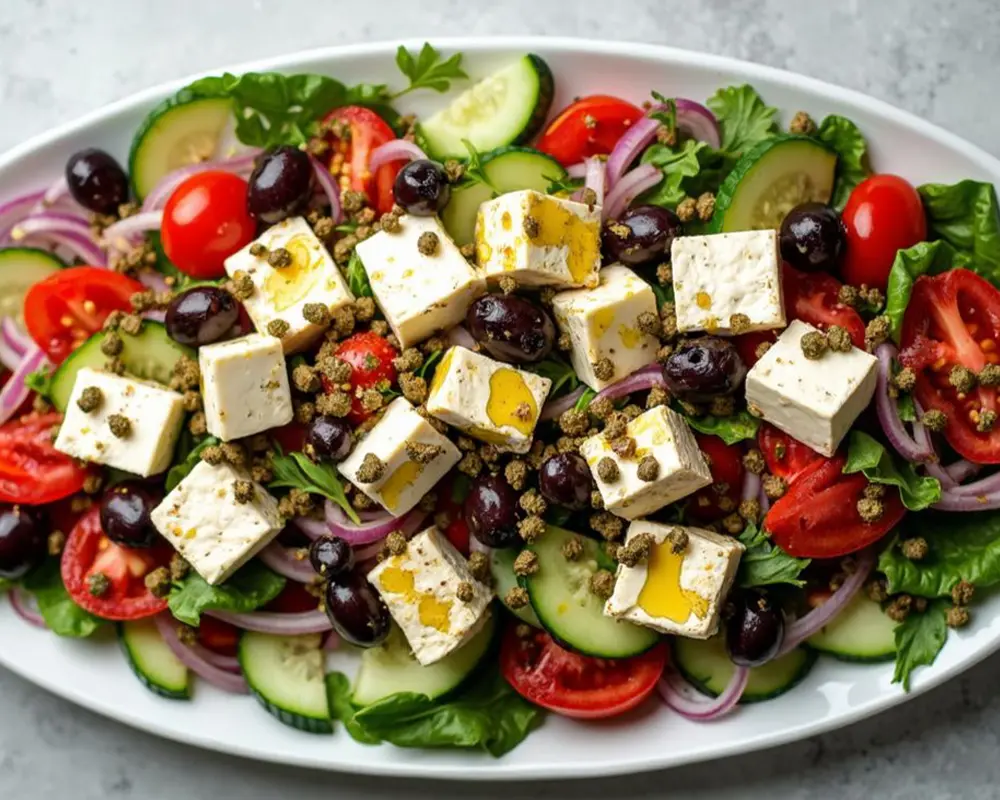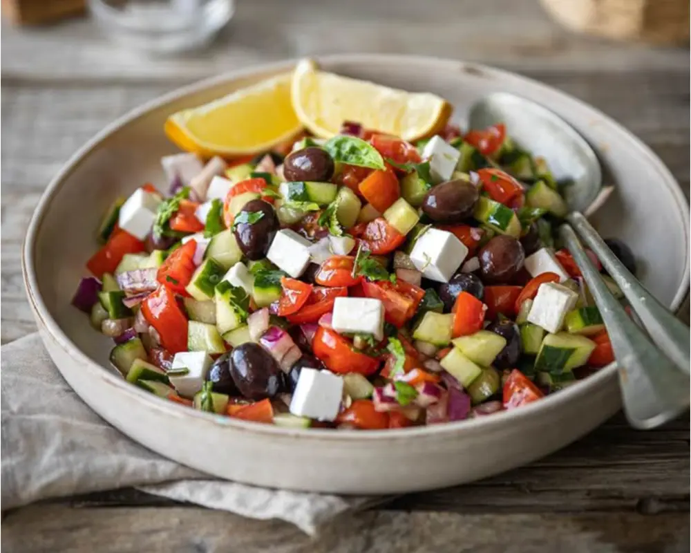 2 tomates maduros em cubos 1 pepino japonês em rodelas ½ cebola roxa fatiada 80 g de queijo branco ou feta em cubos Folhas de manjericão a gosto Sal a gosto 2 colheres de sopa de azeite de oliva